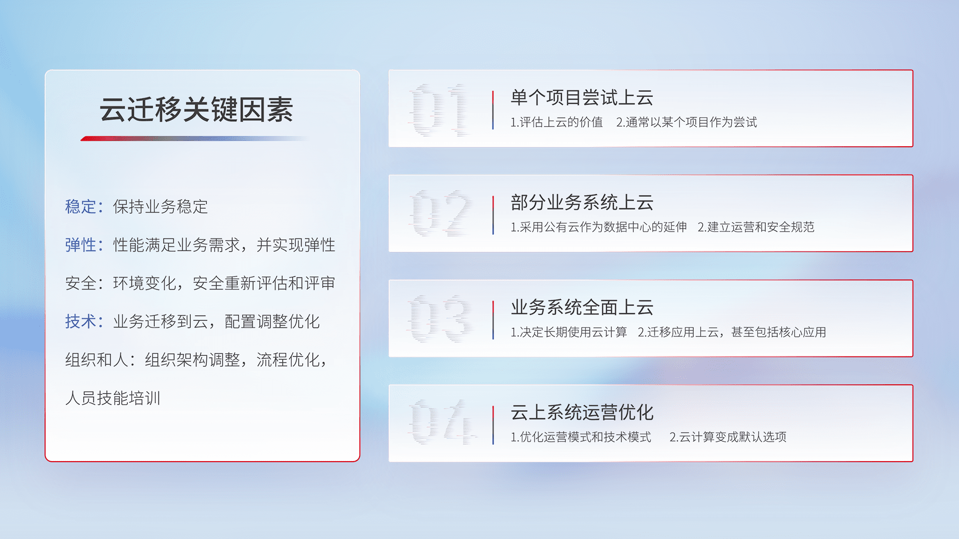 结合实际业务,,,,从规划设计、、、云平台选型、、、、云原生改造、、数据迁移、、、、集成交付,,,迁移全过程为客户识别最佳上云路径,,,,做好风险识别管理,,,设计网络架构、、、身份权限、、安全审计合规、、操作审计、、、、日志审计、、监控告警策略、、多站点容灾设计等,,,,对云上基础设施进行整体规划,,提升IT治理水平,,,以满足弹性、、、、高可用、、、高性能的需求。。。。