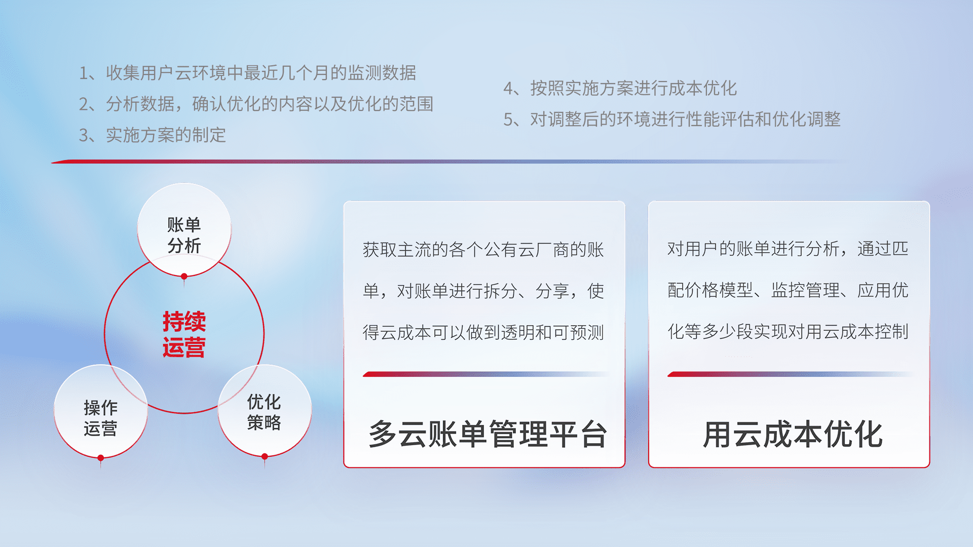 通过多云纳管,,,以统一的资源数据模型把客户的云资源进行抽象和封装,,进而实现对多云资源的统一操作,,,保障云资源管理的可靠性、、稳定性与可用性。。量身定制化运维内容,,,配置、、开发运维、、、、补丁管理、、备份、、监控、、、、认证和访问管理、、审计和日常巡检等,,,保障在用云过程中的可靠度,,稳定度以及高可用率。。。